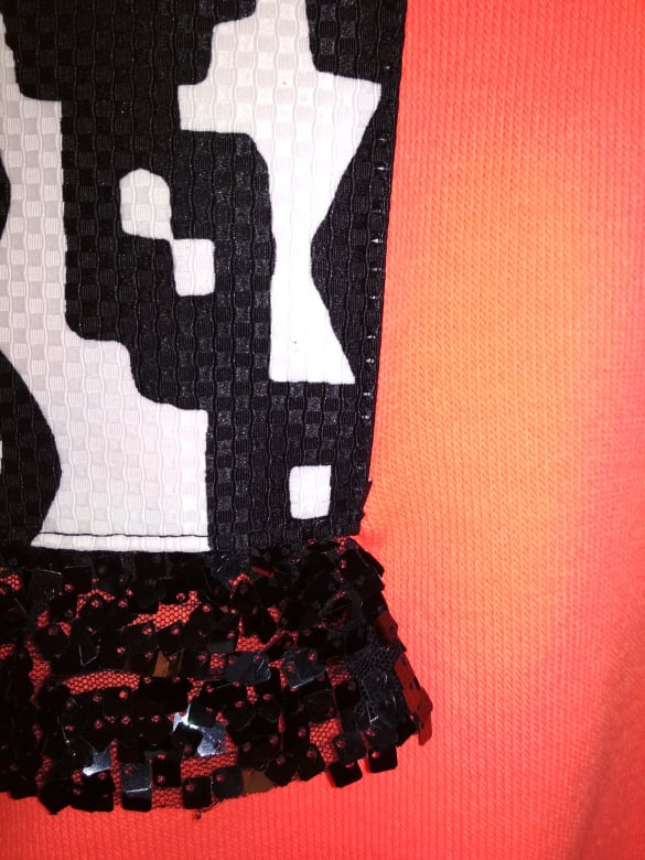 This T-shirt is made from a fabulous jersey fabric! It’s a very good choice for autumn and spring because it keeps you a little warm. The pocket is made of a luxury fabric with black and white patterns. At the pocket’s bottom is a small piece of black fabric with square spangles.