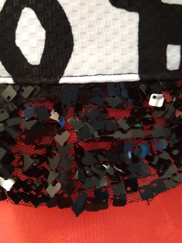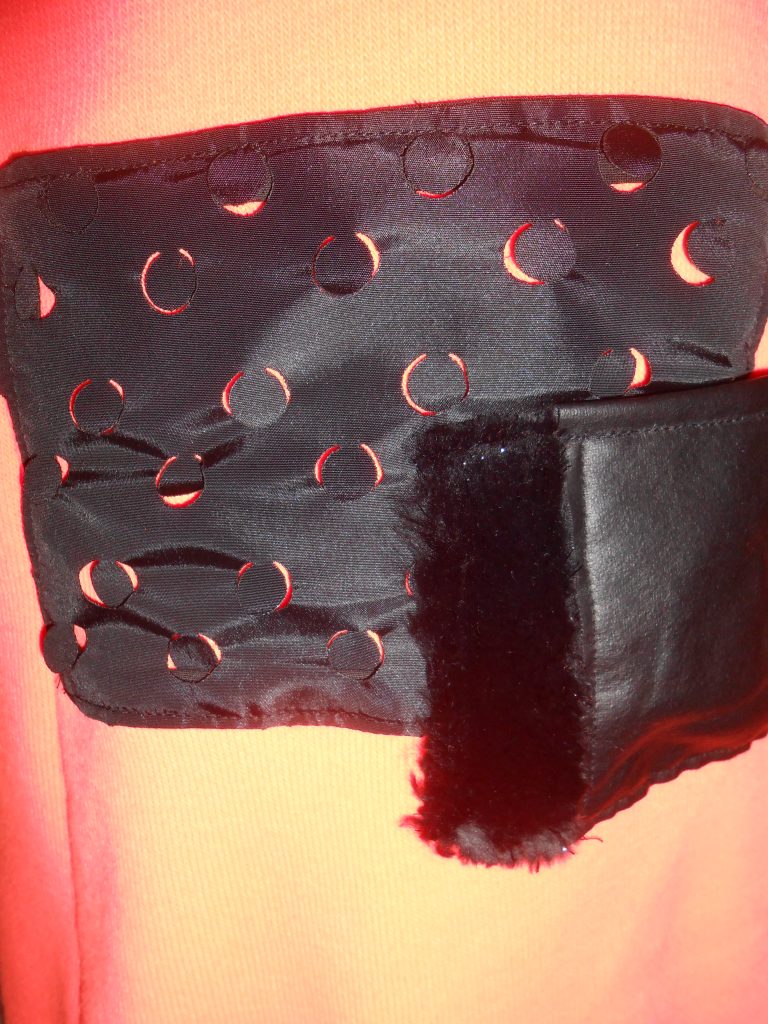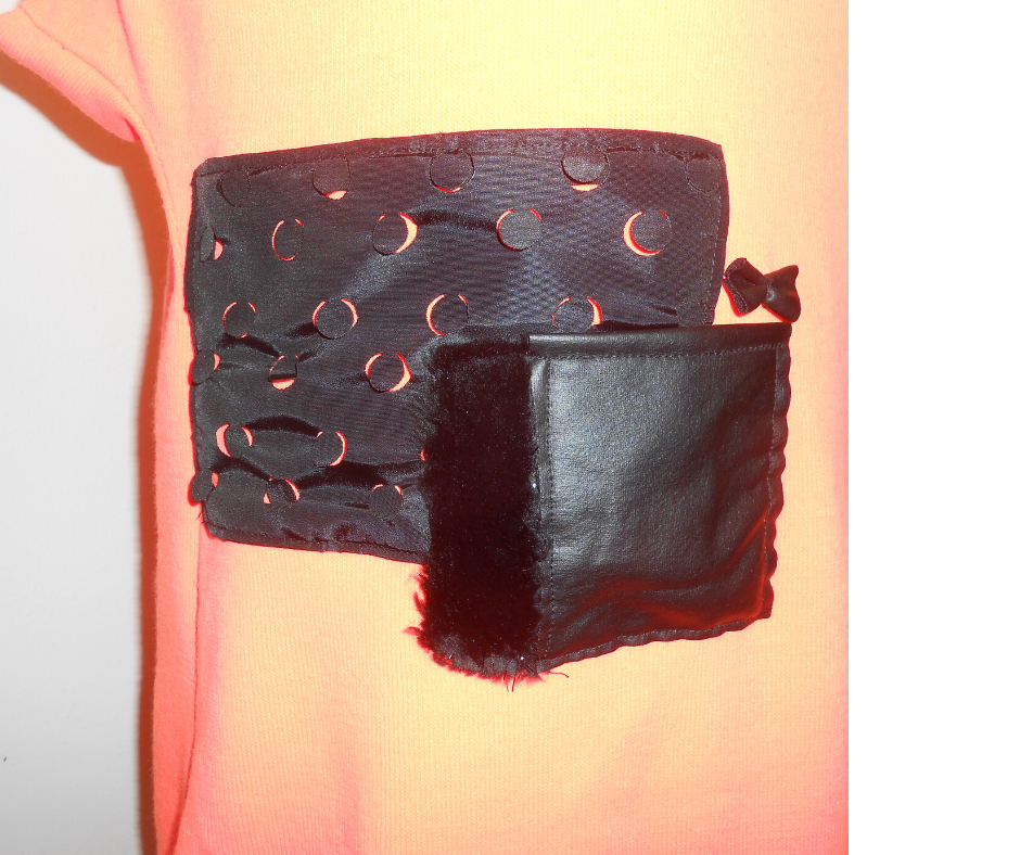 This T-shirt is made from a fabulous jersey fabric! It’s a very good choice for autumn and spring because it keeps you warm enough. The pocket is made of imitation leather and the background of the pocket is a fantastic polyester fabric with holes! Next to the leatherette is a piece of synthetic fur with glitter.