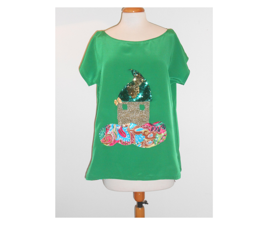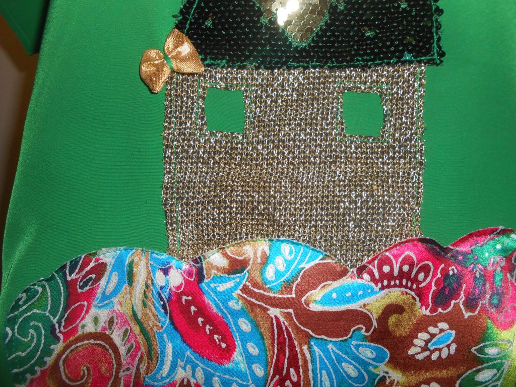 This fabulous T-shirt is made of a synthetic deep emerald green color fabric. The lovely house is made of synthetic satin chintzy fabric, golden net and the roof is made of two sided spangly fabric. The garden is made of a fantastic synthetic satin chintzy fabric.