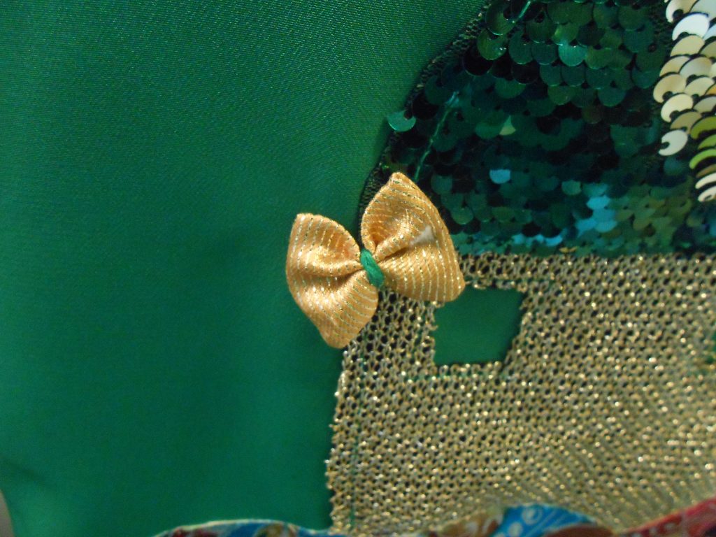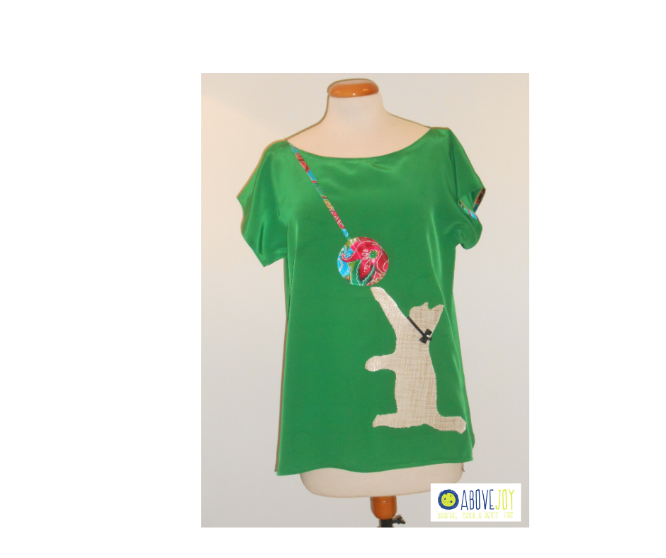 This fabulous T-shirt is made of a synthetic deep emerald green color fabric. The lovely cat is made of a very good quality silver cotton fabric. The ball is made of a chintzy satin fabric.